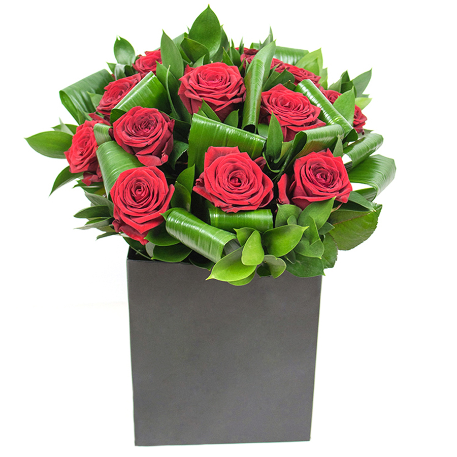 Embrace the grace of our red rose bouquet, featuring a beautiful combination of vibrant red roses, aspidistra leaves, and ruscus, meticulously arranged for a stunning display.